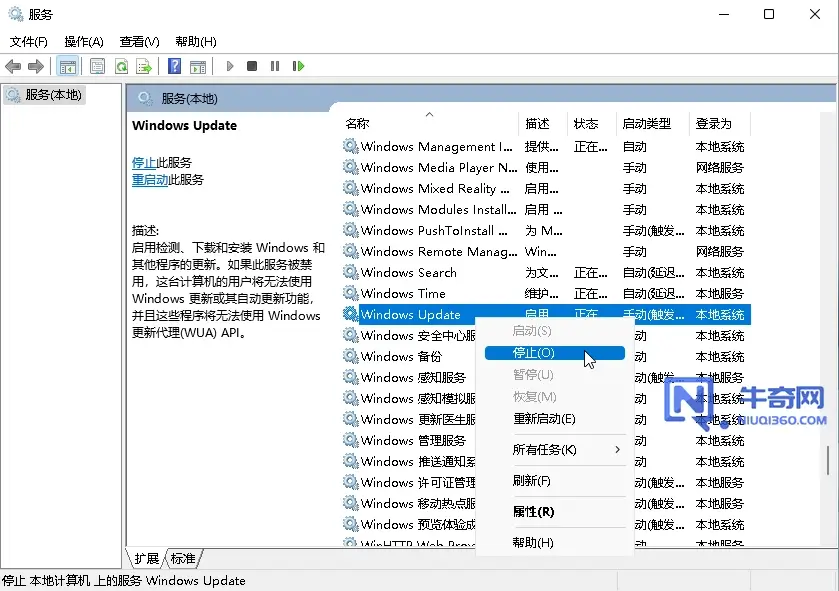 然后,再右键点击Windows Update从弹出菜单点击“停止”即可。